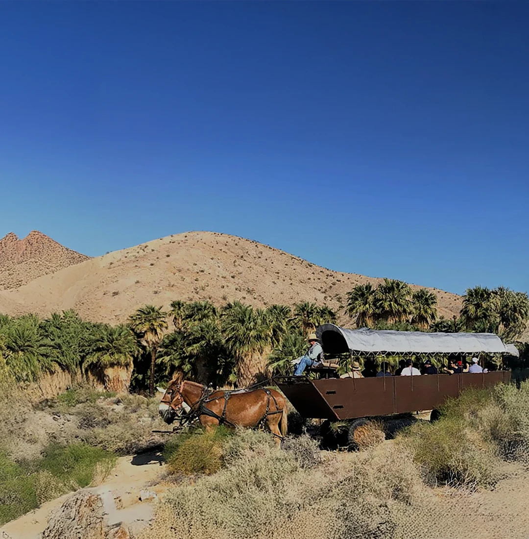 Join us for a Unique Western Palm Desert Adventure and Desert Eco Tour on a Mule Drawn Covered Wagon. Travel through picturesque landscapes in a protected Oasis wilderness preserve. Your experienced naturalist guide and wagon driver will provide educational and entertaining insights about the local plant life, wildlife, geology, Native American and Pioneer history of this wilderness formed by the San Andreas Fault. The tour includes an optional guided nature walk!